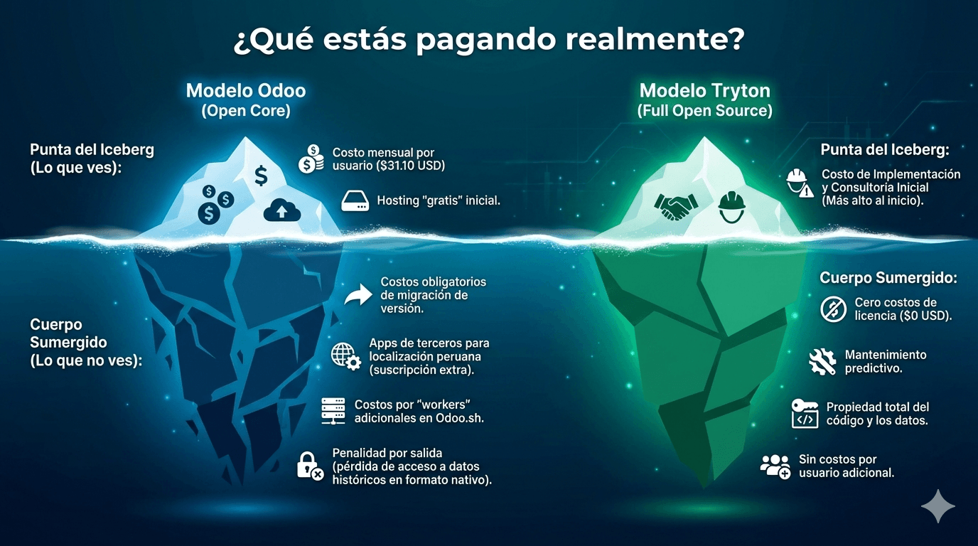 Este informe de investigación exhaustiva, Odoo vs Tryton costos reales revelados, elaborado para la comunidad Tryton Perú, tiene como objetivo desmantelar las narrativas de marketing y exponer los costos reales, técnicos y filosóficos que subyacen a las dos opciones de código abierto más debatidas en el mercado actual: Odoo y Tryton. A través de un análisis comparativo profundo, «desnudamos» los modelos de negocio para revelar que la gratuidad inicial a menudo esconde la hipoteca de la libertad futura.